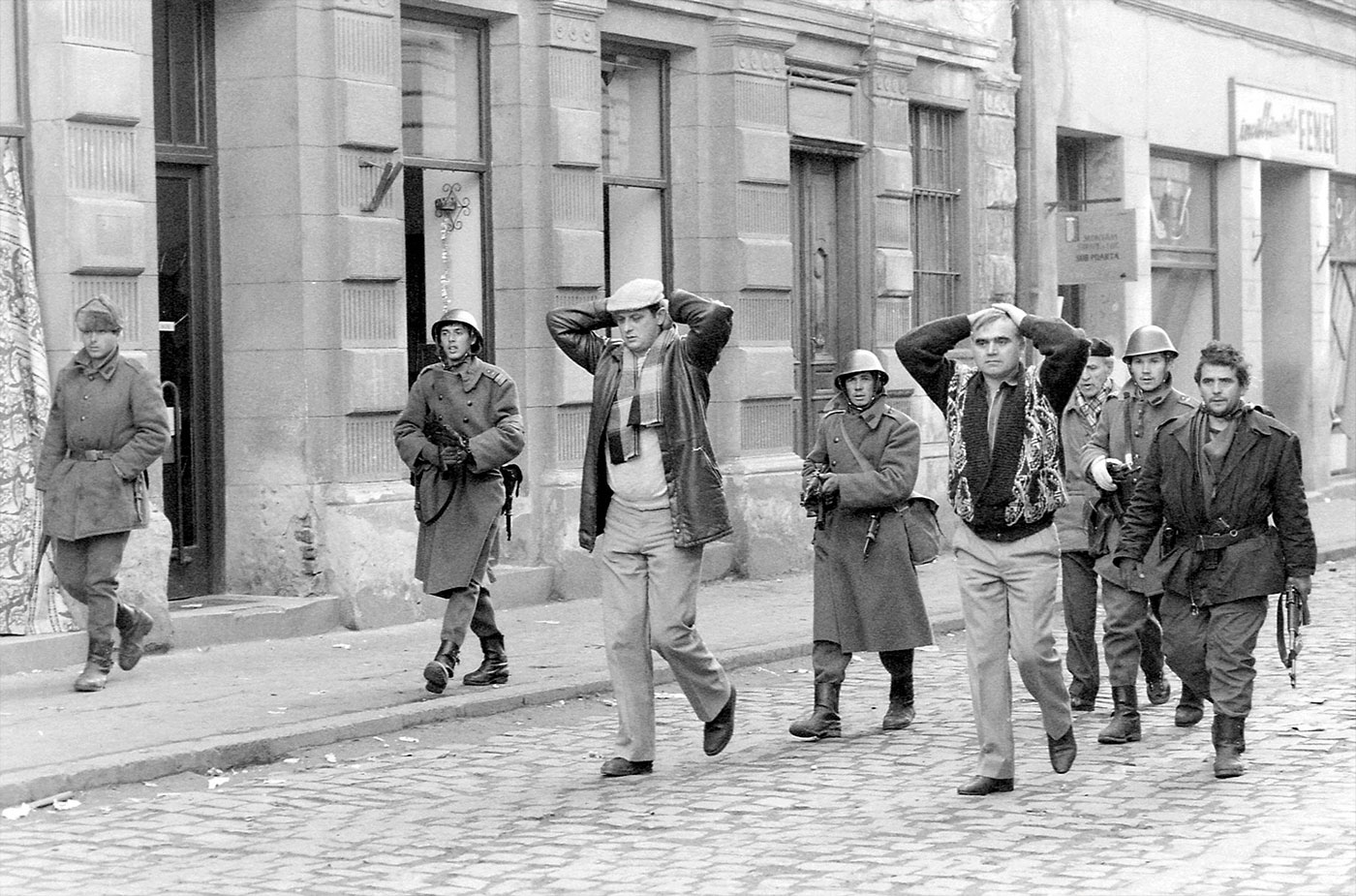 Гэтых двух людзей вайскоўцы выцягнулі зь іх аўтамабіля ў Тымішаары і вядуць пад канвоем Fortepan