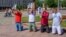 Каля ста дзяўчат сталі ў ланцуг у белым адзеньні і зь белымі і чырвонымі кветкамі каля аўтавакзалу ў Горадні.
