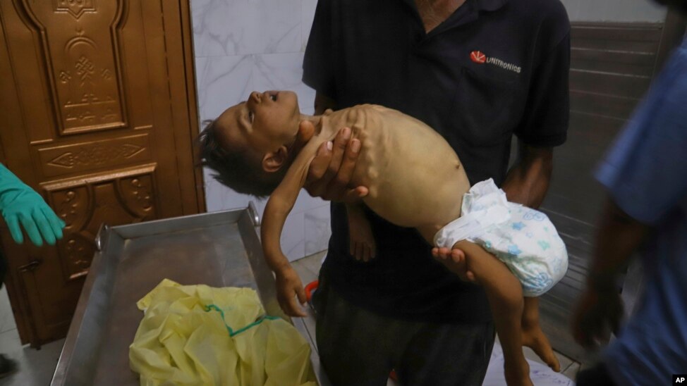 Izrael tagadja, hogy éhínség dúlna az enklávéban, és vitatja a gázai kormány egészségügyi minisztériuma által közzétett halálozási adatokat. Az AP képén az 5 hónapos Zainab Abu Halib teste egy hán juniszi halottasházban, július 26-án. A kórházi zárójelentés szerint a csecsemő halálát alultápláltság okozta