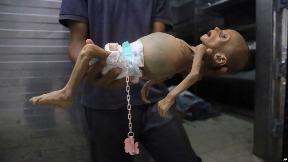 Doktor Ahmed Basal vizsgál egy alultáplált csecsemőt a gázavárosi Al-Rantisi Kórházban augusztus 7-én. Bár az élelmiszersegélyek izraeli blokádját július végén feloldották, még mindig nagyon kevés élelmiszersegély jut el az enklávéba