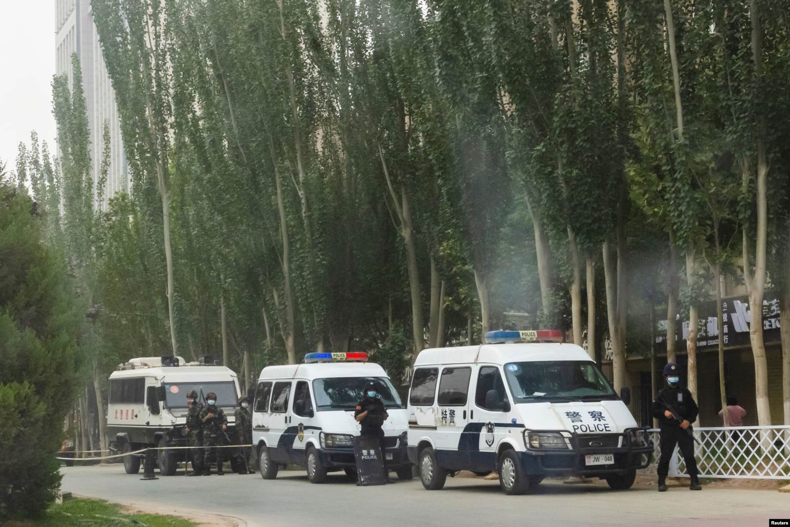 Қашқар көшелерінде тұрған полиция көлігі мен офицерлер. Қытайдың Шыңжаң аймағы. 4 мамыр 2021 жыл.