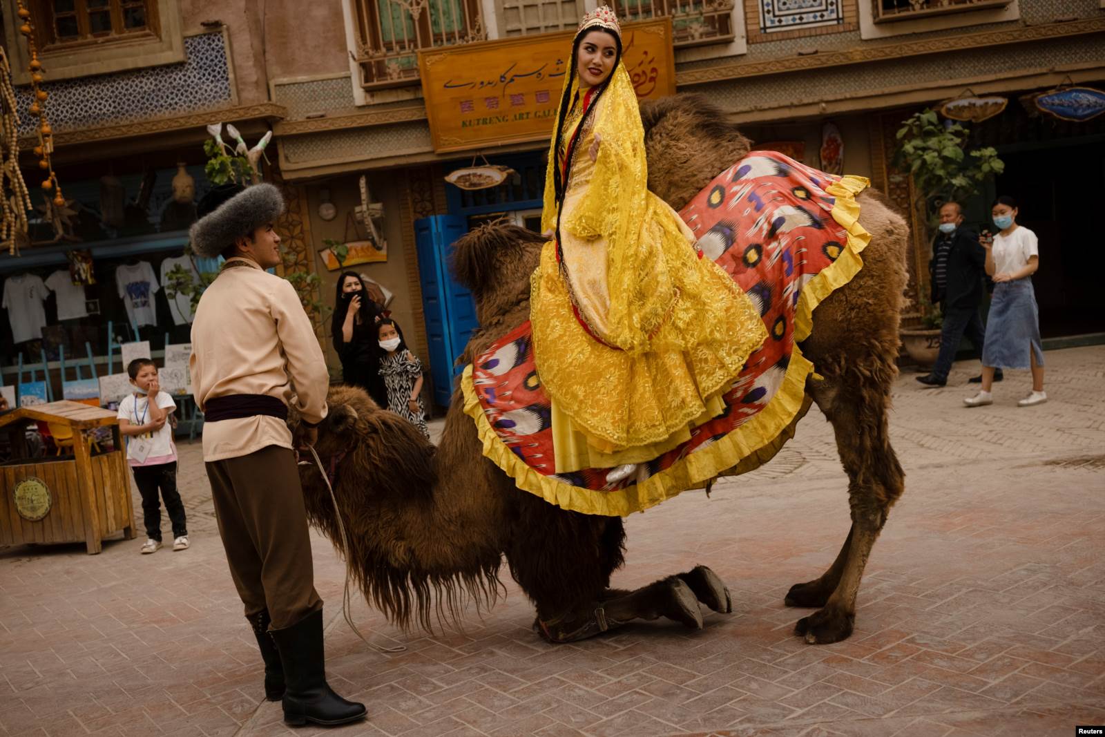 Түйе ерткен әртіс ұлттық киім киіп, өнер көрсетіп жүр. Мамырдағы мереке күндері көне қала – Қашқарда турист көп. 4 мамыр, 2021 жыл.