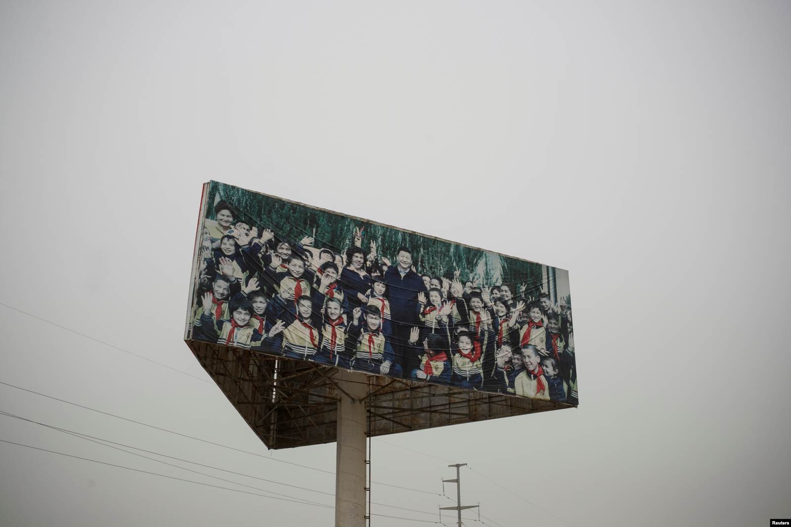 Билеуші Коммунистік партияны мадақтайтын билбордтар арасында дәстүрлі киім киіп, түйеге мінген адам фотокамера объективіне жымия қарайды.