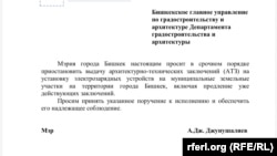 Быйыл февраль айында Бишкектин мэри Айбек Жунушалиев тиешелүү мекемелерге кат жолдоп, муниципалдык жерлерге кубаттоочу каражат орнотуу үчүн архитектуралык-техникалык корутунду берүүнү тез арада токтотууну, буга чейин түзүлгөн келишимдердин мөөнөтүн узартпоону өтүнгөн.