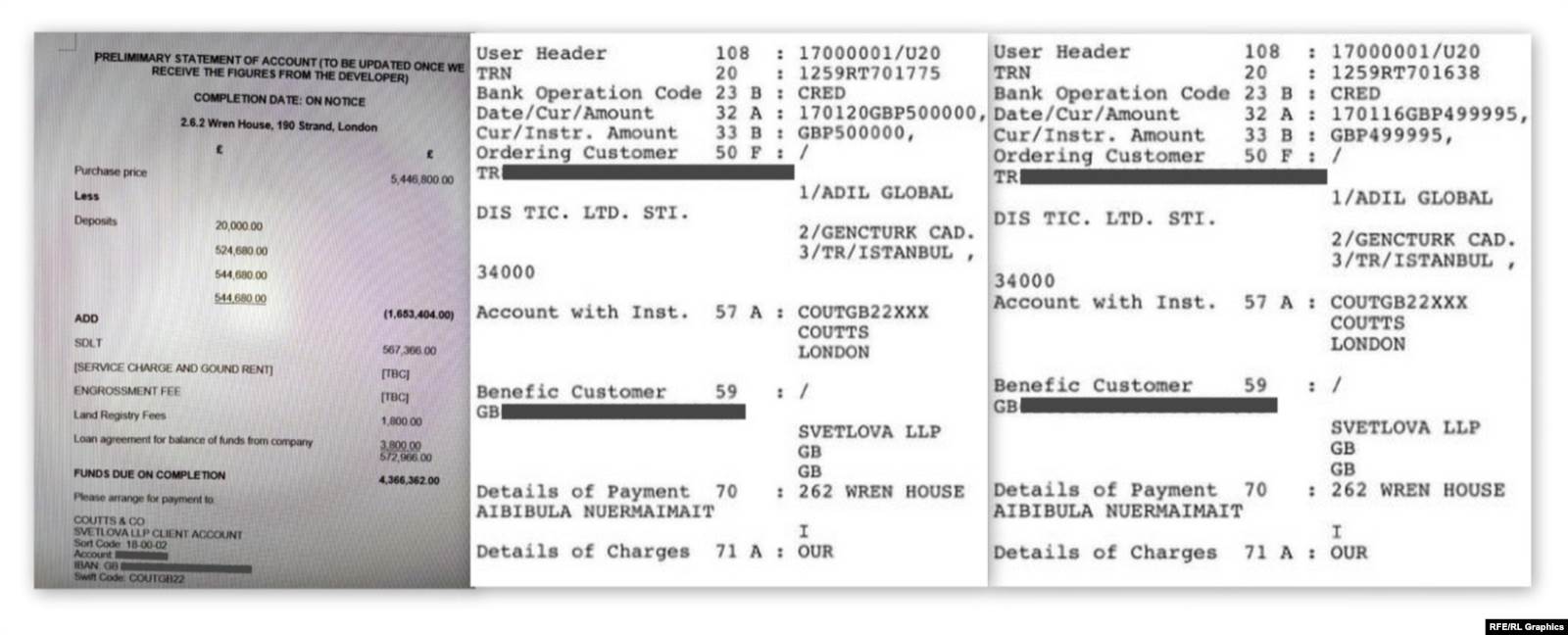 Эки акча которуу 2017-жылдын январында 1 миллион фунт стерлинг Лондондогу Svetlova LLP юридикалык фирмасына берилгенин айгинелейт. Бул фирма орус тилдүү жана чет жакта жашаган, анын ичинде Британиядан мүлк сатып алууну көздөгөн кардарларды тейлейт. Банк эсептеринин көчүрмөсү көрсөткөндөй, фирма мүлктү сатып алууда ортомчу болгон.
