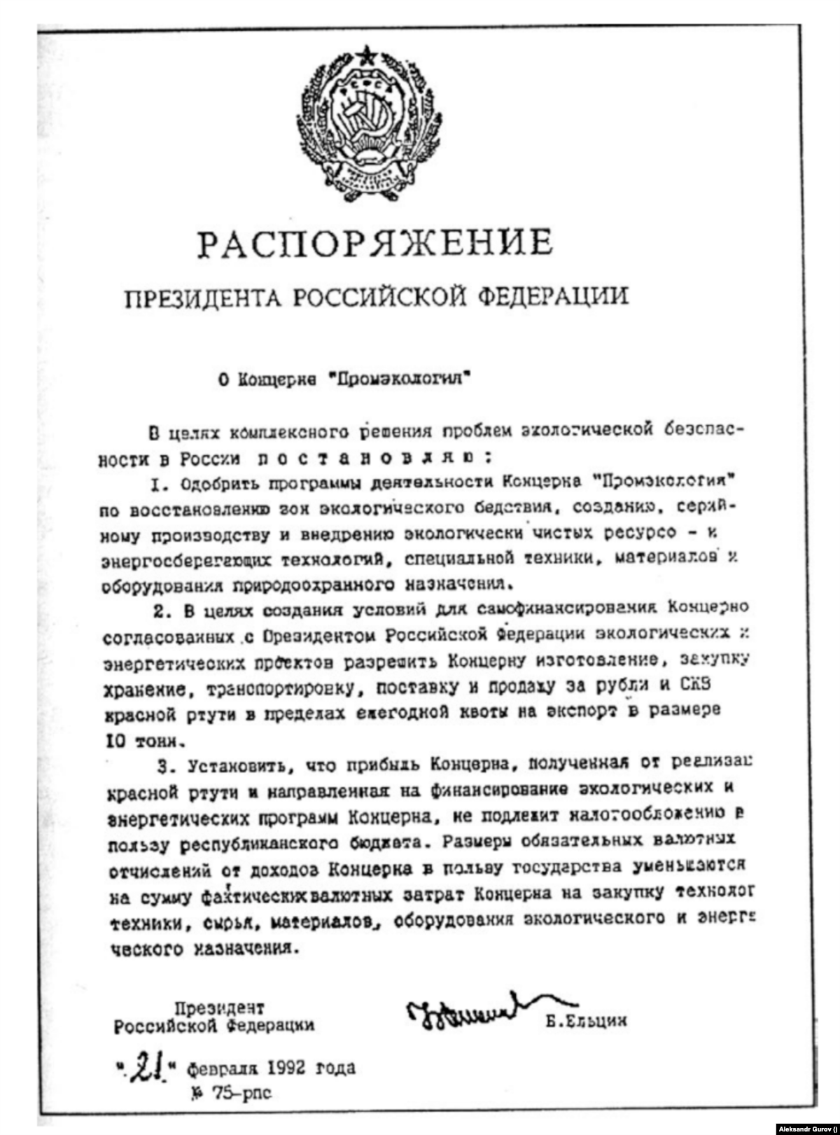 Распоряжение Бориса Ельцина о производстве и реализации красной ртути