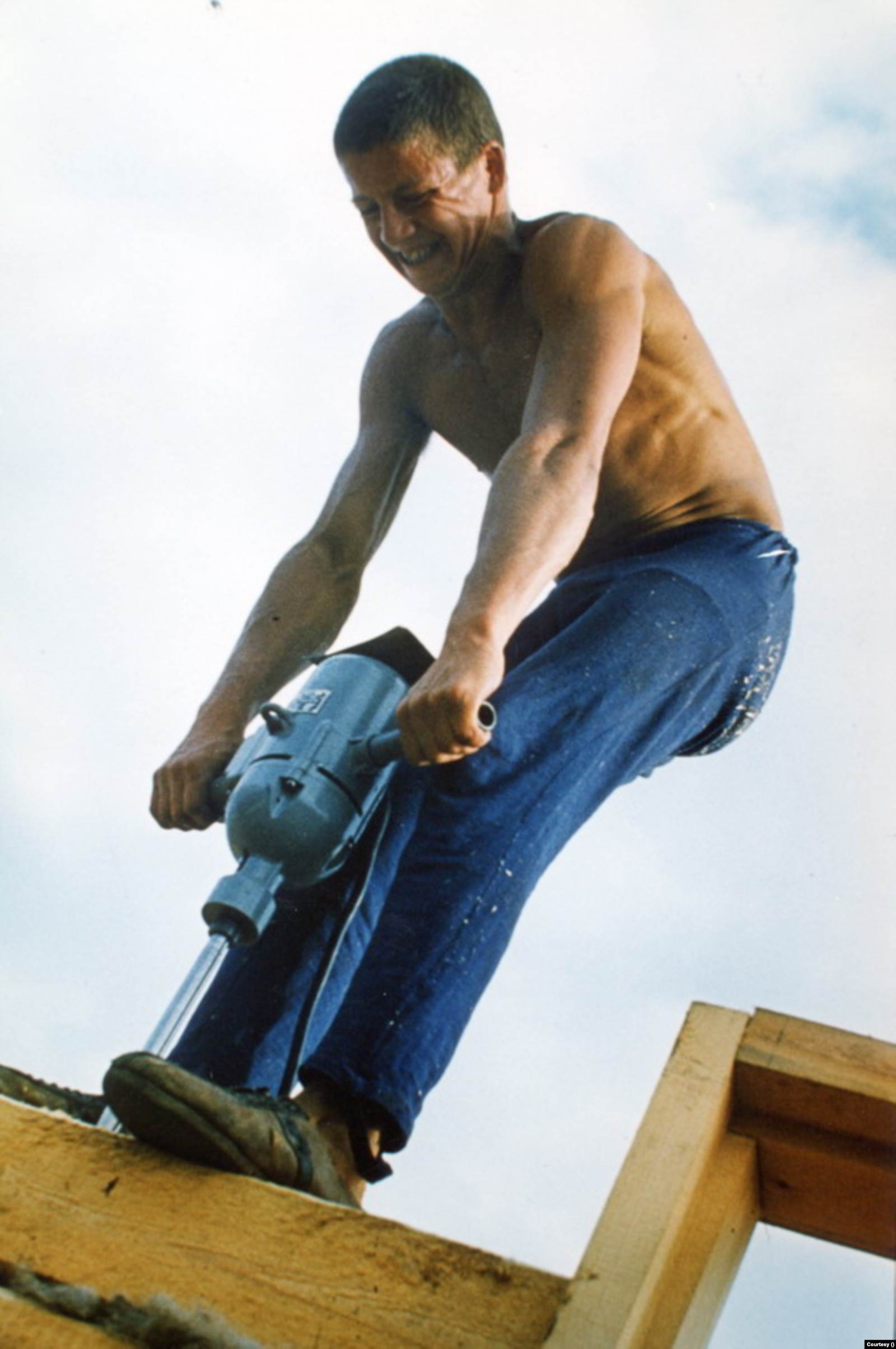 Участник стройотряда "Надежда" физфака ЛГУ Олег Захаржевский на стройке в Коми, 1980 год