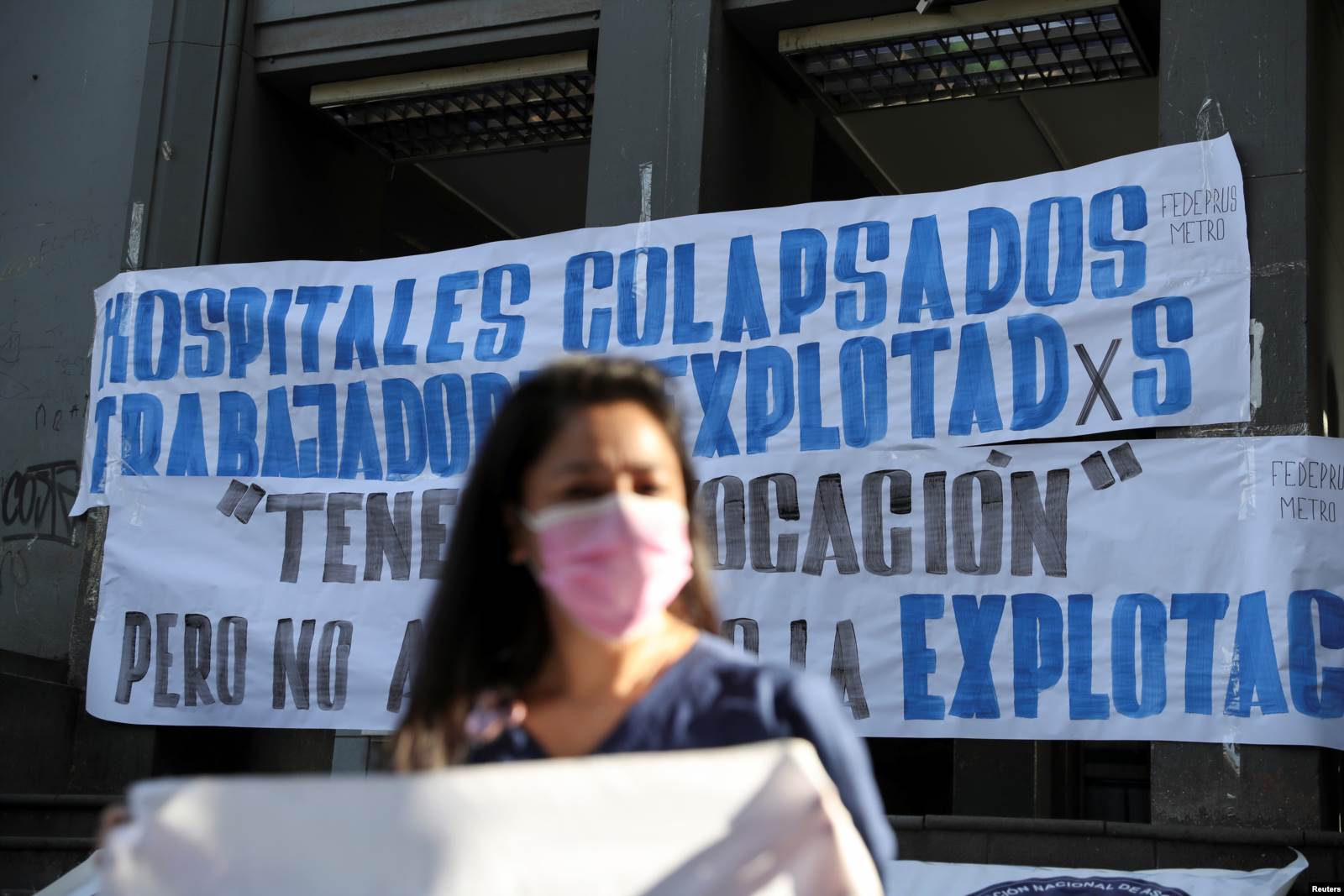 "Больницы переполнены, врачи перегружены": акция протеста медиков, требующих улучшения условий труда во время борьбы с пандемией. Сантьяго, Чили, апрель 2021 года. Фото: Reuters