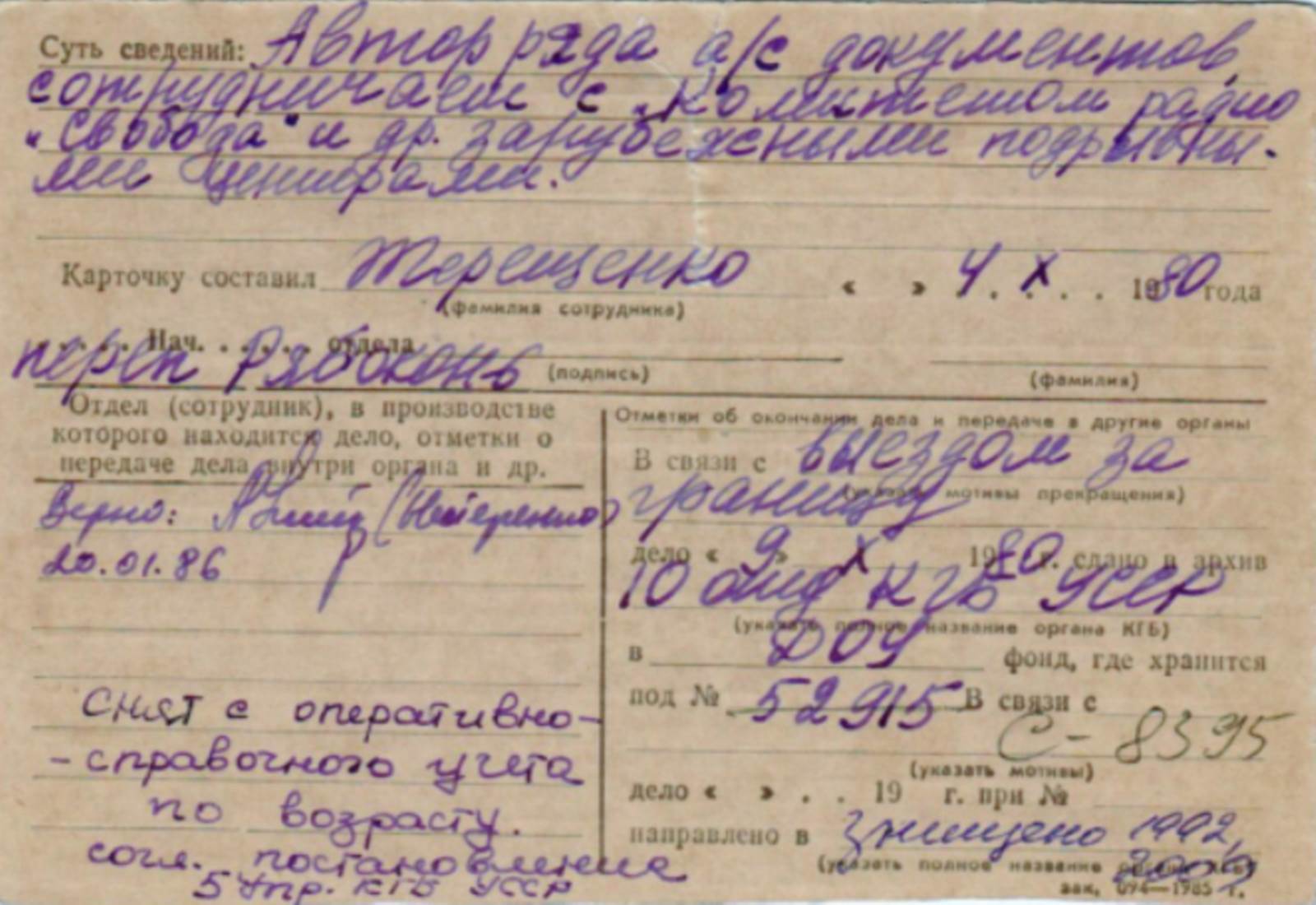 В 1980 году дело оперативной разработки на "Архитектора" прекратили "в связи с выездом за границу" и сдали в архив. К сожалению, оно не сохранилось. Как указано в предоставленной архивом СБУ карточке учета, все собранные за годы материалы были уничтожены в 1992 году. Вряд ли дело содержало принципиально новые сведения по сравнению с тем, что излагалось в записках для Шелеста и Щербицкого. Однако в деле было на порядок больше подробностей и прямой речи фигуранта, фотографии, сделанные оперативниками КГБ, и сведения об агентах из окружения писателя, которые помогли бы установить их имена.