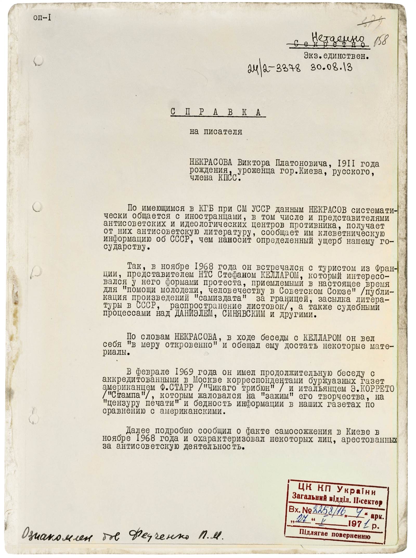 Помимо упоминаемых записок и справок для ЦК КПУ, в архиве СБУ есть трехтомное дело на Некрасова, заведенное в 1974-м. В нем – протоколы обыска и допросов, копии некоторых изъятых документов, а также копии материалов из дел Глузмана и Середняк 1972 года. Поскольку подозреваемым Некрасов так и не стал, дело окончилось ничем.