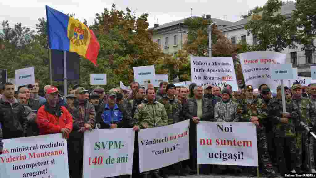 Zeci de membri ai Societății vânătorilor și pescarilor au protestat în fața Ministerului Ecologiei nemulțumiți că a fost interzisă vânătoarea la speciile de păsări acvatice și la iepurele de câmp în sezonul de vânătoare 2015-2016. Una din principalele revendicări ale protestatarilor este demisia ministrului de resort, Valeriu Munteanu. În același timp, un grup de activiști pentru drepturile animalelor și protecția mediului au protestat împotriva vânătorilor, îndemnându-i să împuște în farfurii, nu în animale și să devină vegetarieni.