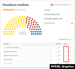 Iată cum ar arăta redistribuirea mandatelor de deputat într-o asemenea situație, potrivit Simulatorului Electoral al Europei Libere - o aplicație care permite vizualizarea rezultatelor alegerilor și modelarea hărții parlamentului.