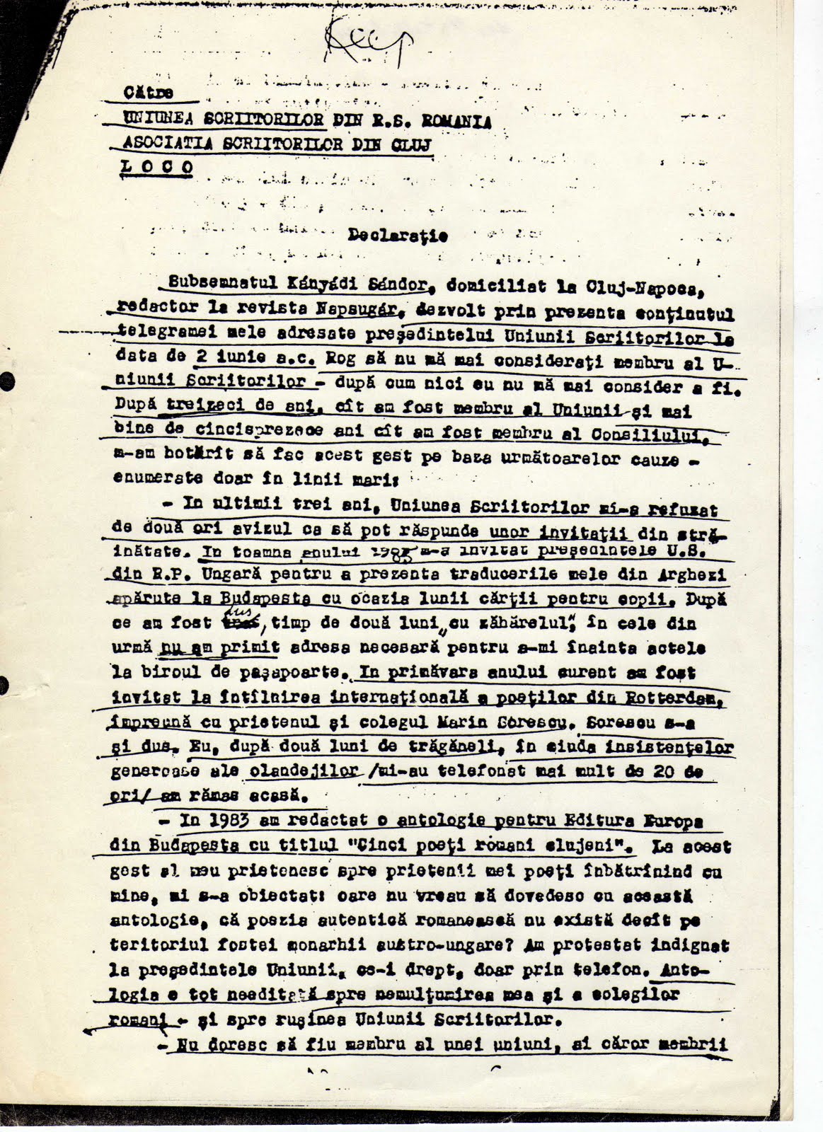 În jurul lui Sándor Kányádi, recenzat pînă şi în oficiosul PCR, „Scînteia”, s-a aşternut o tăcere de plumb, după ce, în 1987, a protestat public împotriva politicii culturale rigide şi anti-minoritare a regimului ceauşist. Atunci, Kányádi a demisionat din Uniunea Scriitorilor din România. Despre acţiunea de protest a poetului (aici pagina 1 şi aici pagina a-2-a a scrisorii către Uniunea Scriitorilor, din 14 iulie 1987), născut la Porumbeni (Nagygalambfalva), în Harghita, la 5 mai 1929, a relatat şi postul de radio Europa liberă. Emisiunea dedicată lui Kányádi a fost monitorizată de către Securitate. Documentul datat 8 noiembrie 1987, se află în arhiva CNSAS, pe lîngă multe alte materiale din care rezultă, că poetul s-a aflat deja în anii 1950 în vizorul poliţiei politice. Supravegherea s-a intensificat odată cu arestarea nevestei lui Kányádi, acuzată de simpatii pentru revoluţia din Ungaria, din 1956. Ulterior, Securitatea l-a avut în vizor, suspectîndu-l de iredentism şi naţionalism.