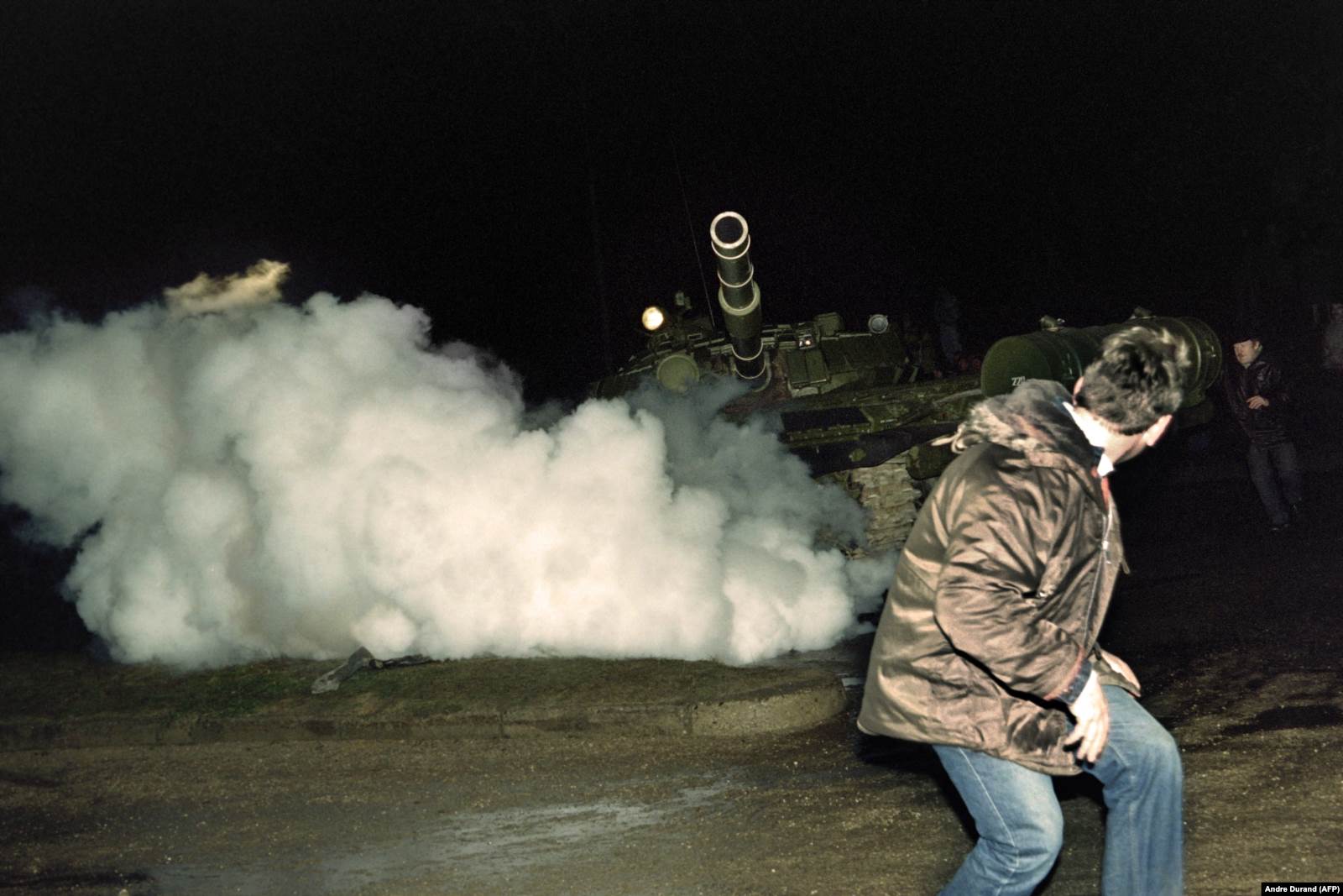 В ночь с 12 на 13 января советские военные взяли штурмом телецентр и телевизионную башню. В результате погибли 14 защитников телебашни, сотни были ранены. Люди погибли от огнестрельных ранений и под гусеницами танков. Во время этих событий также погиб один боец группы "Альфа". Его случайно застрелили свои же, когда силовики штурмовали телецентр.
