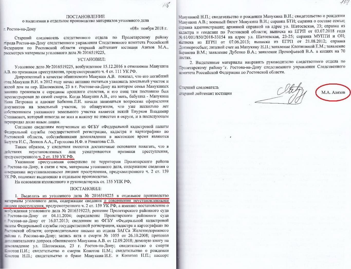 Одной из новых владелиц квартиры Манукиных, согласно выписке из единого госреестра недвижимости, стала некая Ирина Егорова – а в 2017 году следователь из управления СК по Пролетарскому району Дмитрий Егоров подпишет отказ в возбуждении уголовного дела против полицейских, которых Алексей Манукин обвинил в избиении с целью дачи признательных показаний.