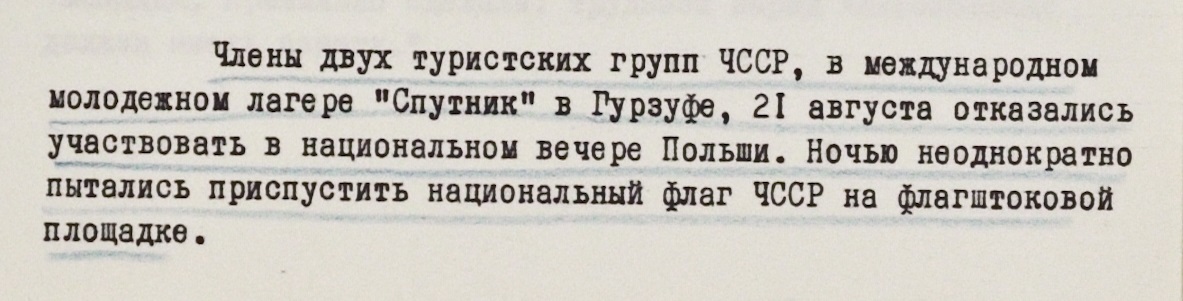 Перепиской “нежелательные” контакты граждан двух стран не ограничивались. КГБ отмечает, что летом 1968 года “значительно ухудшилось” поведение чехословацких туристов, приезжающих в СССР. Последние стали слишком часто говорить с местными о политике и позволять себе антисоветские выпады. При этом звучали куда более резкие выражения, чем в письмах. Например, один из туристов заявил: “Да, вы освободили нас от фашизма и за это вам спасибо. Но у вас такая огромная страна, богатая полезными ископаемыми, а вы не смогли до сих пор наладить производство хорошей одежды и обуви… В отношении космоса, то вы достигли больших успехов. Однако нам уже надоело слушать во всем СССР и работать по его указке”.