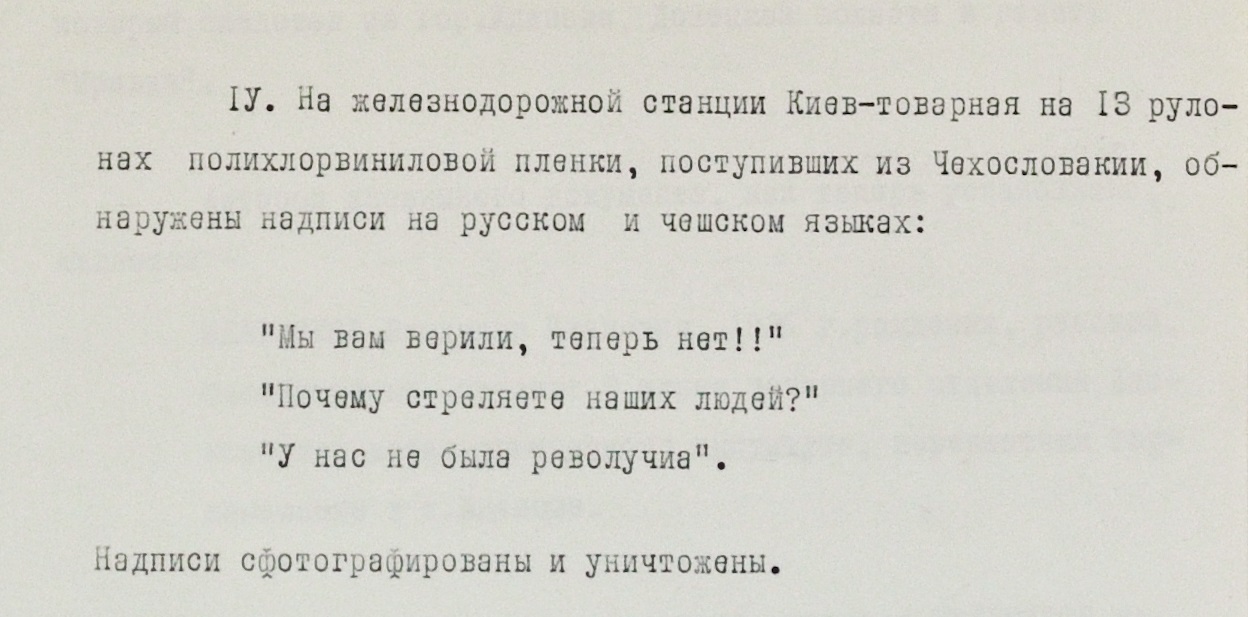 На рулонах полихлорвиниловой пленки, прибывшей товарным поездом в Киев, обнаружили надписи: “Мы вам верили, теперь нет!”, “Почему стреляете наших людей?”, “У нас не было револучиа”.