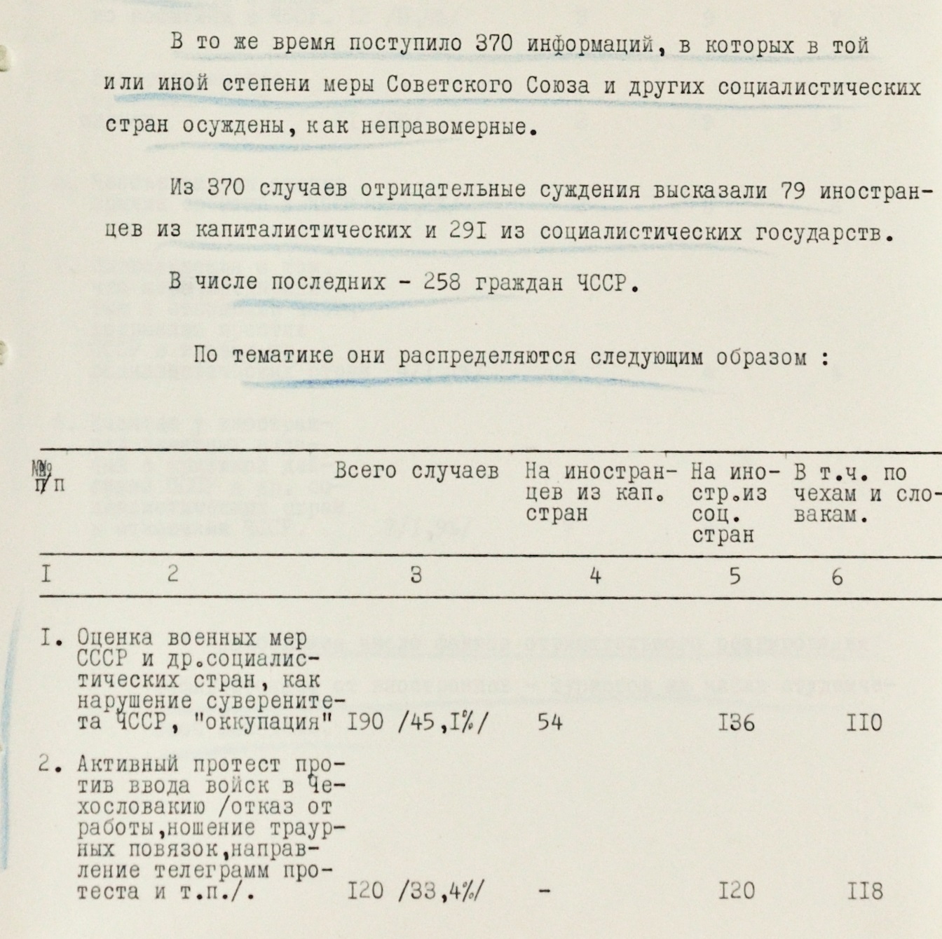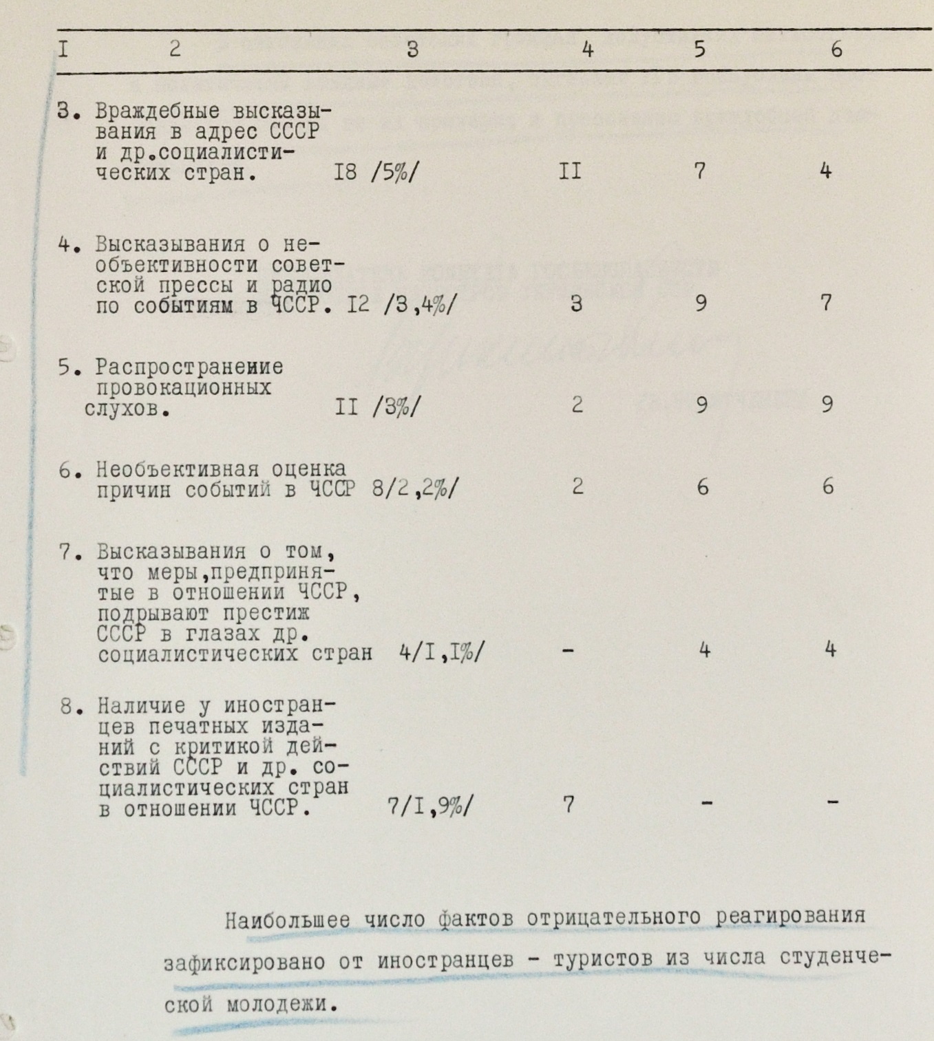 КГБ приводит статистику зафиксированных “негативных проявлений” иностранцев в ответ на вторжение за период с 21 августа по 7 сентября (то есть 17 первых дней операции). Отдельно приведены данные по приезжим из капиталистических стран, гостям из “соцлагеря”, а также жителям ЧССР. Всего было зарегистрировано 370 эпизодов, из которых 258 были связаны с жителями Чехословакии. 110 граждане Чехословакии называли действия Варшавского блока оккупацией. 118 раз активно протестовали: отказывались работать, носили черные повязки, отправляли соответствующие телеграммы. 4 раза из их уст звучали враждебные высказывания в адрес Советского Союза и других стран, участвовавших во вторжении. 7 раз жители ЧССР обвиняли советскую прессу в необъективности, 9 раз “распространяли провокационные слухи”, 6 раз “необъективно оценивали” причины событий в своей стране и 4 раза высказывались о том, что ввод войск подрывает престиж СССР в глазах других стран соцлагеря. Чаще всего “негативные проявления” отмечались среди иностранных туристов из числа студентов.