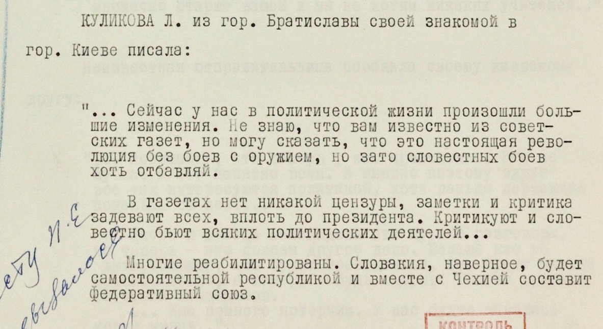 “Не знаю, что вам известно из советских газет, но могу сказать, что это настоящая революция без боев с оружием, но зато словесных боев хоть отбавляй (здесь и далее сохранены орфография и стилистика писем в том виде, в котором они переданы в документах КГБ. Судя по всему, все приведенные тексты были написаны на русском языке. Авторы, жители Чехословакии, далеко не всегда владеют им в совершенстве)”, – пишет Л. Куликова из Братиславы.