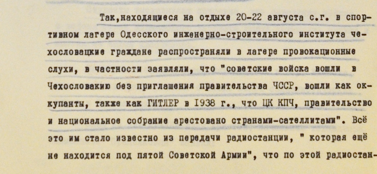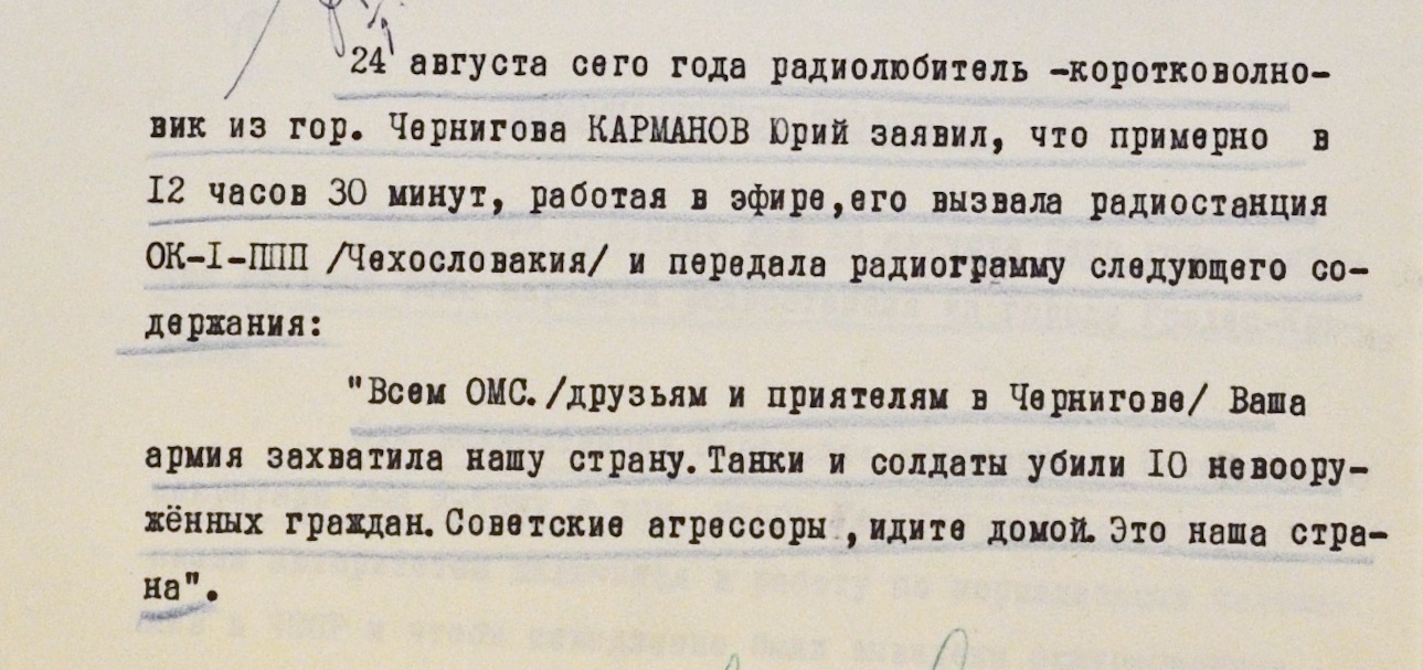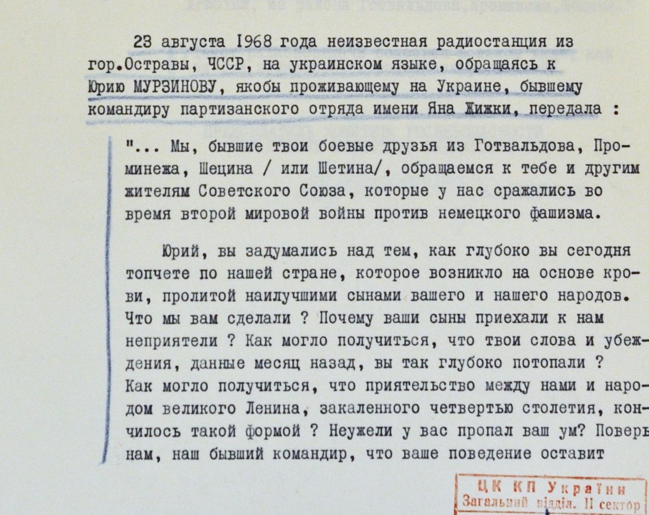 Ветераны Второй мировой войны из Чехословакии делали попытки связаться с советскими боевыми товарищами. 23 августа неизвестная радиостанция из Остравы вышла в эфир на украинском языке. Живущие в городах ЧССР бойцы Первой интернациональной партизанской бригады имени Яна Жижки обращались к бывшему командиру подразделения. В документе КГБ он назван Юрием Мурзиновым, но, очевидно, речь о Даяне Мурзине (Юрием он называл себя во время войны). “Юрий, вы задумались над тем, как глубоко вы сегодня топчете по нашей стране... Что мы вам сделали? Почему ваши сыны приехали к нам неприятели?” – риторически спрашивали бывшие партизаны. Правда, непонятно, почему они считали, что Мурзин находится в Украине, – в те годы годы он проживал в Башкирии.