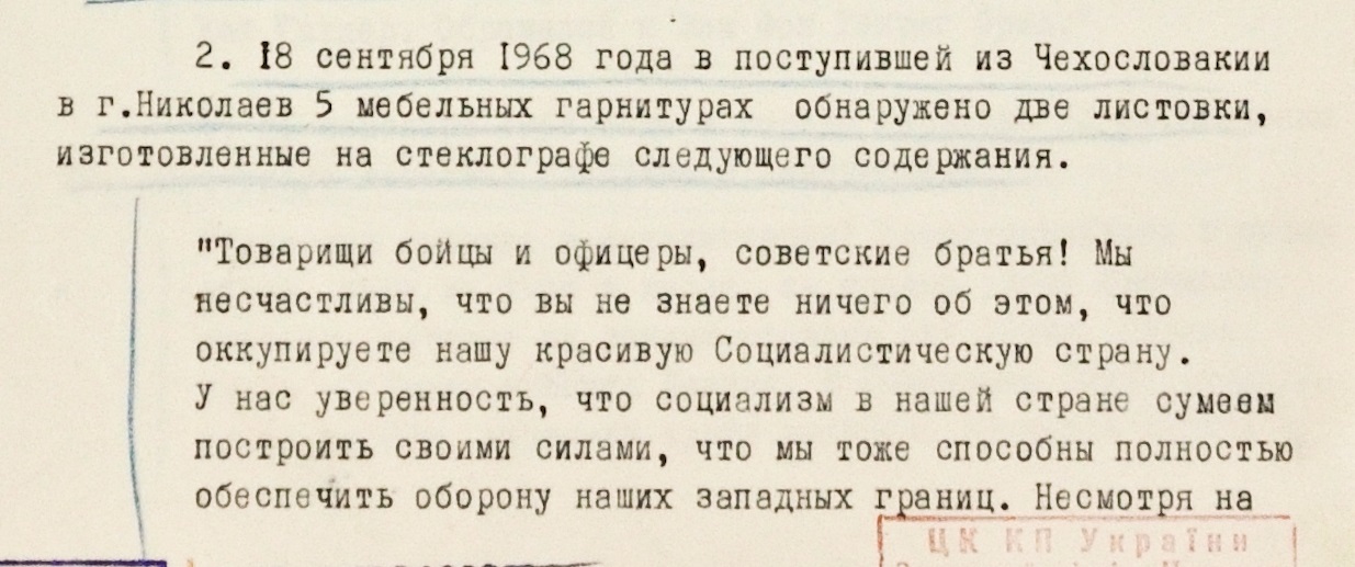 В чехословацких мебельных гарнитурах, поступивших на продажу в Николаеве, были спрятаны листовки с протестом против оккупации.