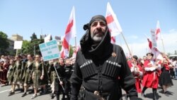 Несколько сотен человек участвуют в шествии, отмечая День святости семьи. Колонна людей с иконами и церковными флагами в национальных костюмах в 13:00 двинулись от здания филармонии, потом прошла проспект Руставели и направилась в сторону кафедрального Собора Святой тройцы.