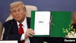 После этого президент США и лидеры Катара, Египта и Турции - стран, при посредничестве которых было достигнуто соглашение между Израилем и группировкой ХАМАС (признана террористической в США и ЕС) о прекращении огня в секторе Газа и освобождении заложников, — официально подписали документ о перемирии.