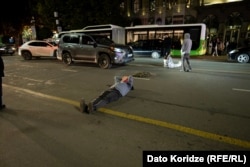 Несколько граждан все же вышли на проезжую часть и остановили движение машин: один лег на дорогу, другой сел прямо на асфальт, третий — писатель Ираклий Ломоури — расположился на принесенном им же стуле. Вскоре полиция начала задержания.