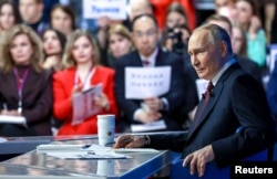 Пресс-конференция президента России Владимира Путина, посвящённая итогам года, проходит в Москве в Гостином дворе. Как и в прошлом году, она совмещена с так называемой «Прямой линией».