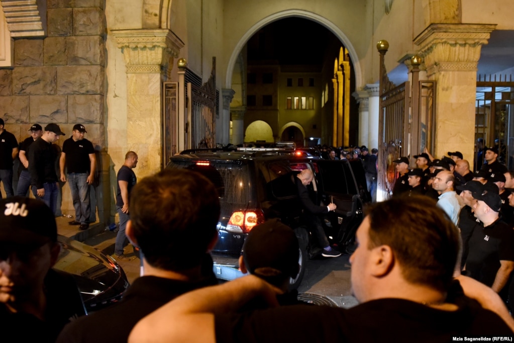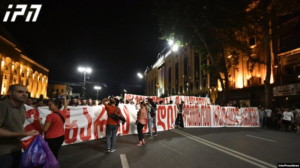 Вечером акция протеста переместилась с проспекта Руставели к центральному офису правящей партии "Грузинская мечта" олигарха Бидзины Иванишвили.