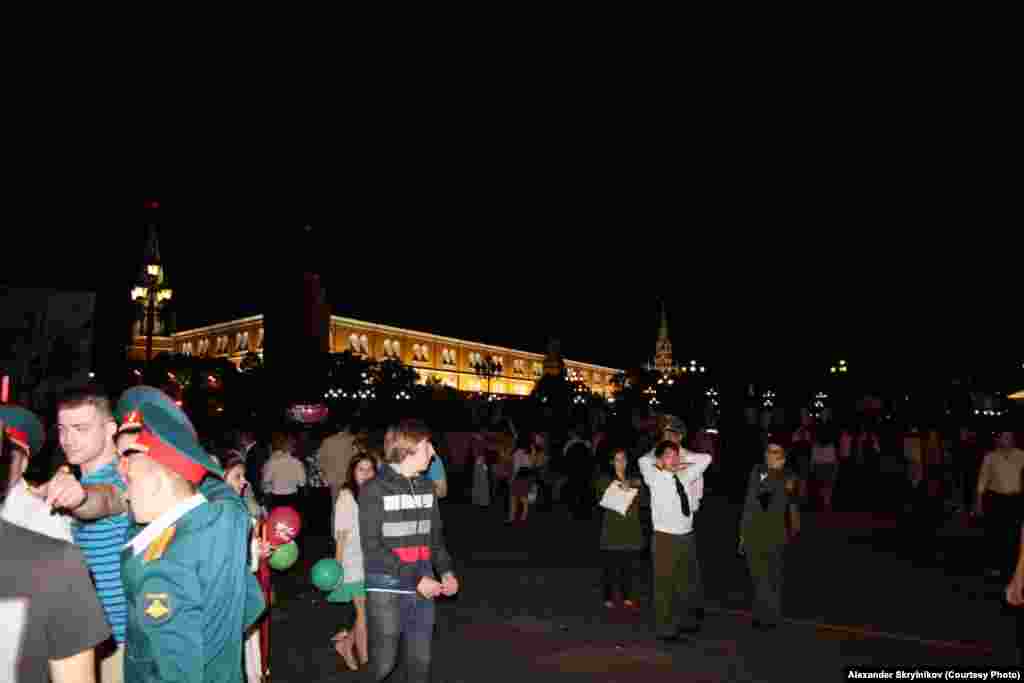В ночь с 23 на 24 июня в школах Москвы прошли выпускные вечера. Многие школы отправили своих выпускников отмечать праздник на Красной площади. Однако, по словам участников гуляния, в том числе учителей, организация прошла не очень успешно - было скучно, пошел дождь и до 6 утра никого не выпускали за оцепление. Фото Александра Скрыльникова.