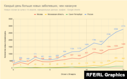 В России продолжается ускоряющийся рост эпидемии коронавируса – каждый день новых заболевших больше, чем накануне. Порядка двух третей заболевших в стране приходятся на Москву и Московскую область (где цифры в последние дни заметно подскочили).