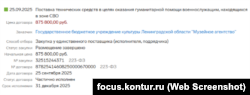 Наконец, в сентябре 2025 года "поставку технических средств в целях оказания гуманитарной помощи военнослужащим, находящимся в зоне СВО" оплатило на сумму в 875 тысяч рублей "Музейное агентство" – организация, управляющая тремя десятками небольших музеев в Ленинградской области (Ладожская крепость, крепость в Ивангороде, домик няни Пушкина и другие). Как и в случае с Выборгским музеем, публично эти поставки нигде не упоминались.