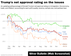 Возможно, методы, которыми администрация ведет поиски нелегалов – нашумевшие рейды ICE, Иммиграционной и таможенной службы, вызывают недовольство, но даже несмотря на нынешнее падение в опросах уровня одобрения президента, в иммиграционной политике он пользуется наибольшей поддержкой. Silver Bulletin: 45% одобряют, 52% не одобряют, RCP: 46-52.