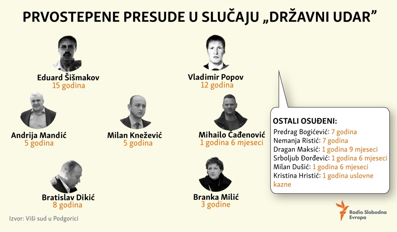 Tokom dvogodišnjeg suđenja, prvostepeno su osuđena dvojica ruskih državljana kojima se sudilo u odsustvu, lideri opozicionog DF-a i grupa srpskih državljana.