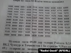 Дар музоядаи ахири рақамҳои ҷуфт ва ё ба истилоҳ "тилоӣ", ки рӯзи 23 ноябр баргузор шуд, шумораи қайди давлатии 9000, бо маблағи 7 ҳазору 600 сомонӣ, ё наздик ба 1600 доллари амрикоӣ, фурӯхта шуд.