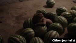 Ин кудак вакто ки, тарбузхоро дид, аз хурсанди бо тарбузхо ба бози даромад. Тарбузхоро мисли туп ба хар тараф давр медод ва чанд дакика пас ин кудакро дар огуши тарбузхо хоб бурд. Ду тарбузро бо дастони хурдакакаш ба багал кашидаву дар тарбузи сеюм сарашро ниходааст, гуё ки дар огуши гарми модараш хоб бошад!!!