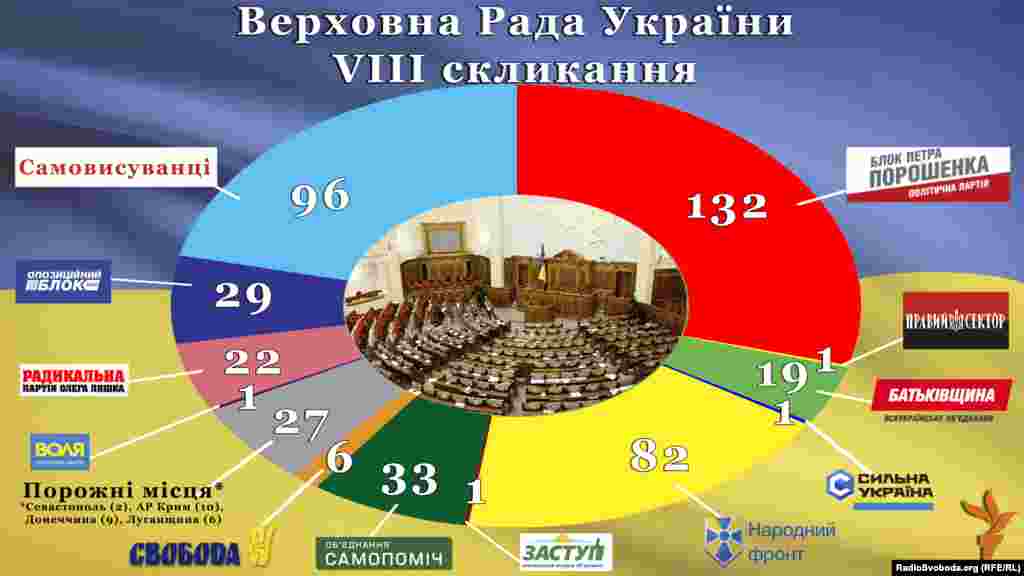 За даними обробки 100% протоколів дільничних виборчих комісій в електронному вигляді, за результатами голосування на позачергових парламентських виборах в багатомандатному загальнодержавному окрузі до Верховної Ради проходять шість партій. Згідно з даними, оприлюдненими на сайті Центральної виборчої комісії, за партію «Народний фронт» проголосували 22,14% виборців, за «Блок Петра Порошенка» – 21,81%, за «Об’єднання "Самопоміч» – 10,97%, за «Опозиційний блок» – 9,43%, за Радикальну партію Олега Ляшка – 7,44%, за Всеукраїнське об’єднання «Батьківщина» – 5,58%.