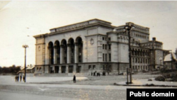 Театр опери й балету, 1943 рік. Відкритий за два місяці до нападу Німеччини на Радянський союз, побудований в «класичному стилі» одеським архітектором Людвигом Котовським. Також Котовський збудував у Сталіно – так у ті роки називався Донецьк – філармонію та будинок центрального міськвиконкому міста, Ворошиловського. На фото після будівництва пройшло всього два роки. Вже 1 січня 1942 року нацисти, захопивши місто, організували тут прем'єру «Запорожця за Дунаєм» Гулака-Артемовського завдяки артистам та технічному персоналу, які лишилися в окупації. Влітку 1943-го року став називатися «Фронтовою оперою» – FRONT OPER Stalino.