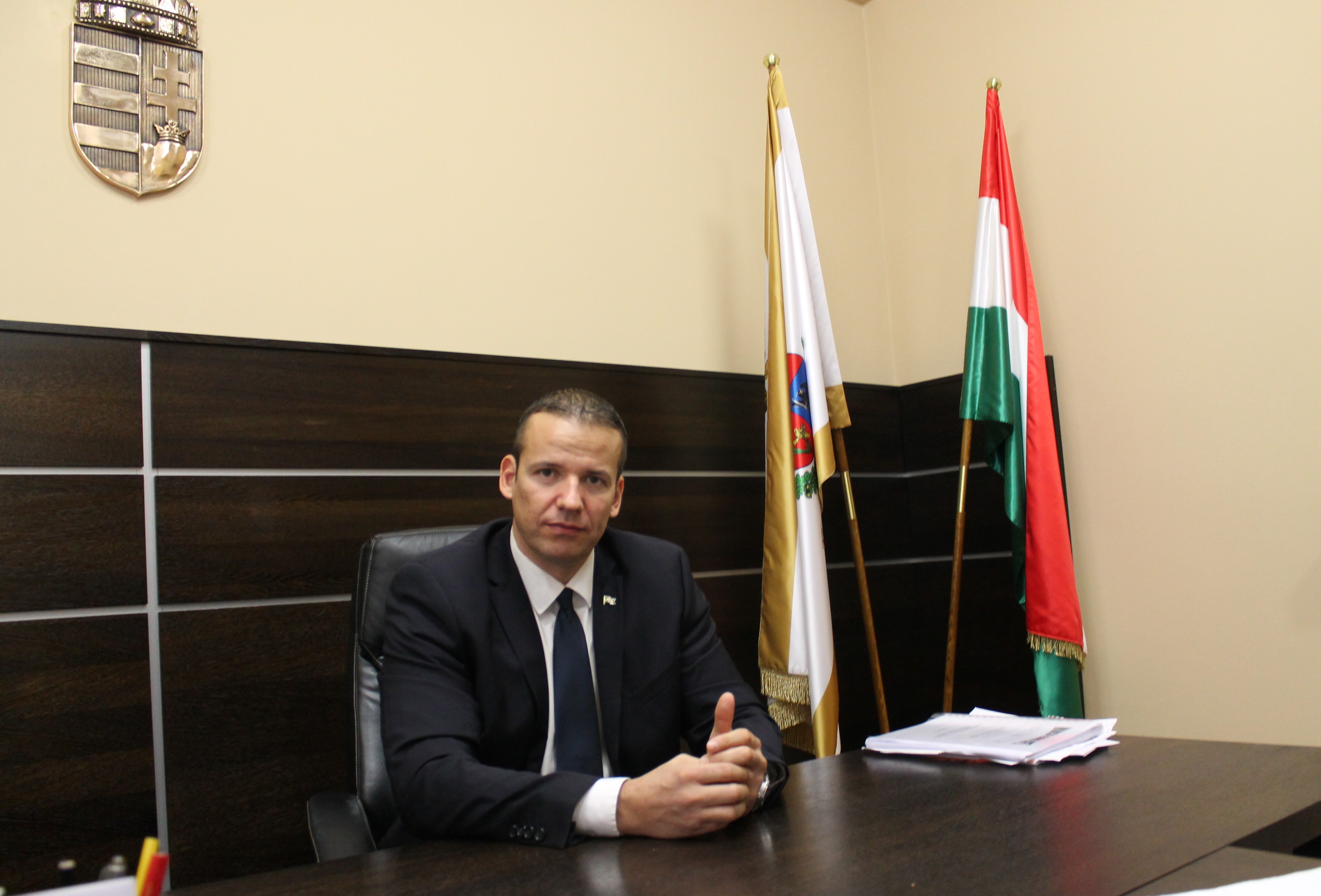 Вікна кабінету Ласло Тороцкая виходять на головну дорогу. Збоку від робочого столу – прапори Угорщини та Ашоттхалома, над головою – державний герб.