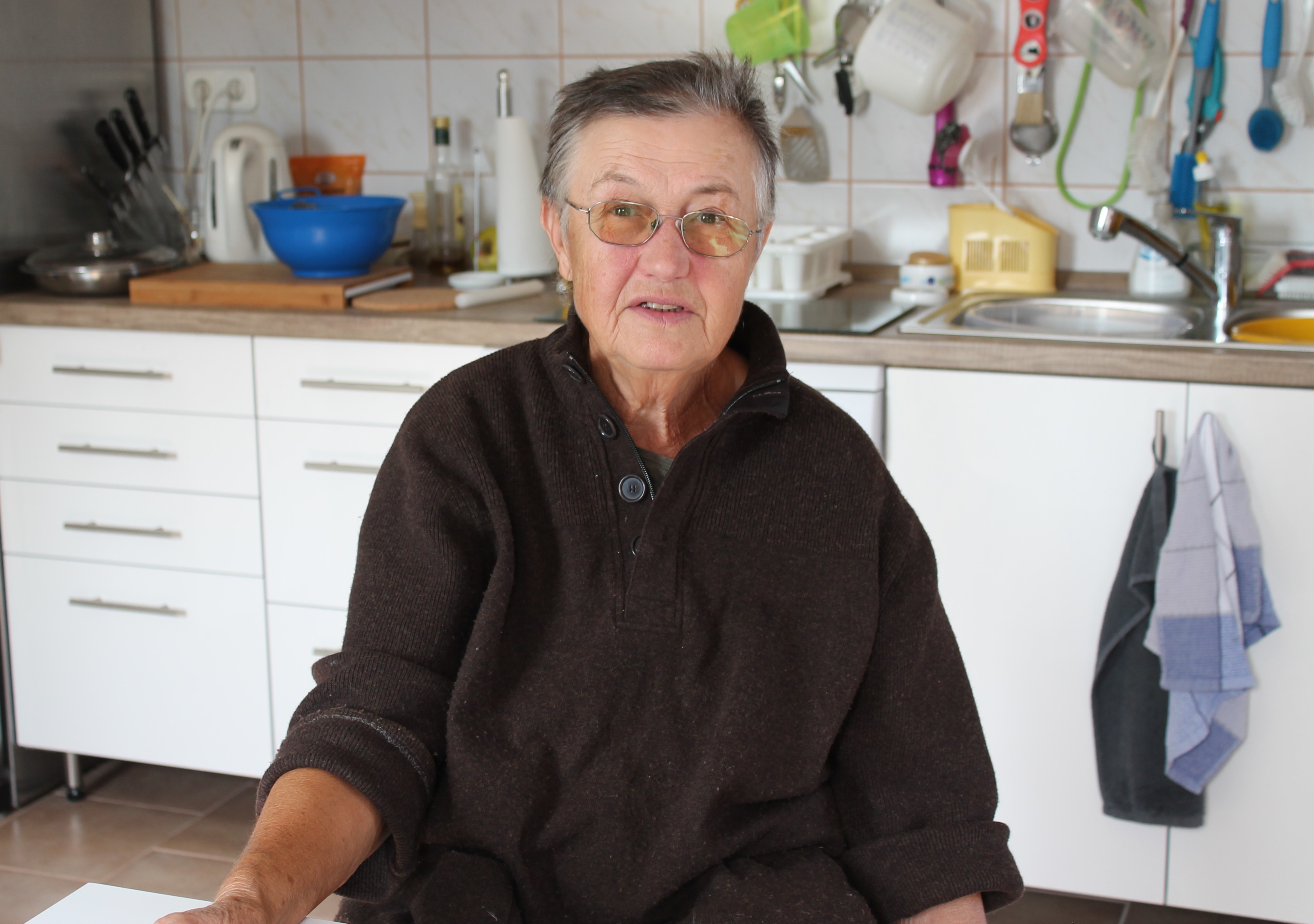 Жінка має 78 років, коротке, злегка сиве волосся і жвавий погляд. Вона народилася у німецькому поселенні в Україні, неподалік Одеси.
