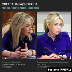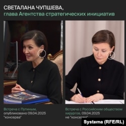 Крім того, на «консерви» вказує і розташування ручок та олівців. Наприклад, на другій зустрічі Путіна зі Світланою Чупшевою у вересні 2025 року письмове приладдя на столі у президента стоять так само, як і на зустрічі з Радіоновою в жовтні. Між двома цими зустрічами пройшло майже півтора місяця та дев’ять інших заходів у кремлівському кабінеті. І щоразу ручки та олівці стояли по-різному, окрім цих двох зустрічей.